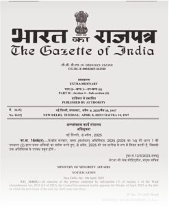 यह अधिसूचना भारत के राजपत्र (The Gazette of India) में प्रकाशित की गई है। अल्पसंख्यक कार्य मंत्रालय द्वारा जारी अधिसूचना के अनुसार, केंद्र सरकार ने संविधान प्रदत्त शक्तियों का उपयोग करते हुए अधिनियम की धारा 1 की उपधारा (2) के तहत 8 अप्रैल 2025 को वह तारीख घोषित की है जिस दिन से वक्फ (संशोधन) अधिनियम, 2025 के सभी प्रावधान प्रभावी हो जाएंगे।